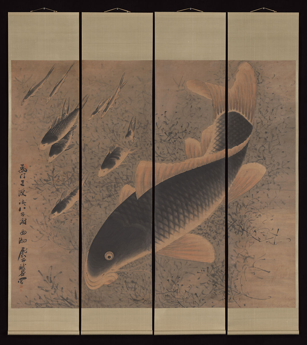 A massive carp leads its eight offspring through thick aquatic grasses below the water’s surface. More than just cute animals, they allude to a line from China’s most ancient poetry collection, the Book of Odes (Shijing). It refers to “nine similitudes” (jiuru 九如)—nine comparisons that imply eternity or longevity (“like mountains,” “like streams,” and so on). Because the term for “similitude” (ru 如) sounds like the term for “fish” (yu 魚), paintings of nine fish became conventional expressions of wishes for longevity and constancy. The painter Gong Gu is otherwise unknown, but the splashy brushwork and broad washes suggest a date from the mid- to late nineteenth century.
