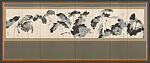 This eight-panel screen by the South Korean painter Song Yeong-bang (b. 1936) depicts a continuous composition of lotus flowers in various stages of bloom. Their large and ornate leaves, dramatically executed in wet splashes of dark and light ink with touches of neutral color, form the focus of the painting, contrasting with the blossoms outlined in pale, dry ink. A group of carp is shown swimming in the water around the plants. The artist’s signature (牛玄: Uhyeon, the artist’s sobriquet) and seal (宋榮邦: Song Yeong-bang) are visible on the lower left of the far left panel.