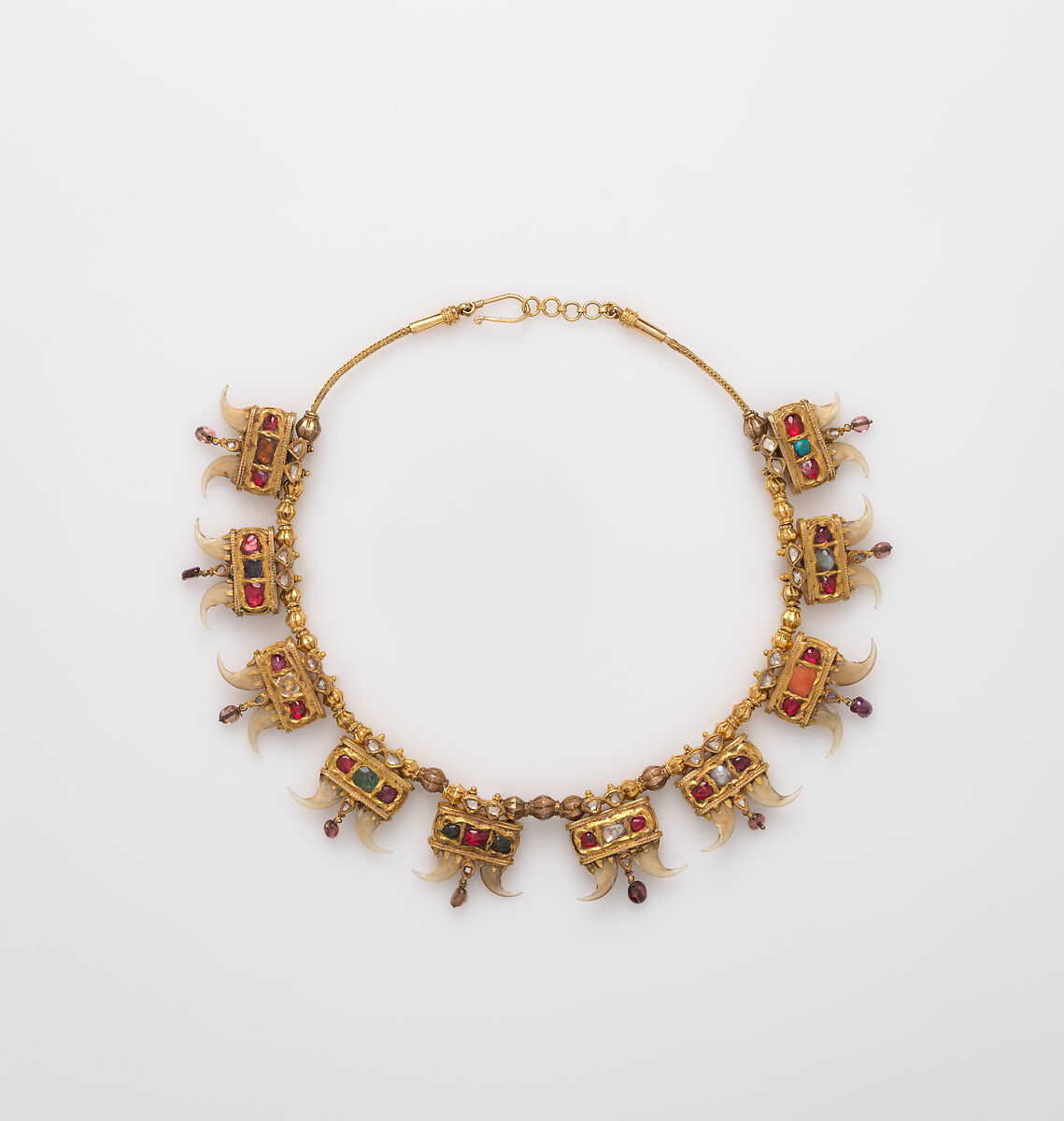 Brilliantly colored gemstones and addorsed tiger claws nestle together to form the strikingly shaped pendants of a nineteenth-century Indian necklace. The use of tiger claws as symbols of power and protection is an ancient motif in India, seen also in gold pendants from ninth-century Java and other regions of Asia. Here, their talismanic properties of the necklace are enhanced by the navaratan gem setting (nine auspicious gems, although here, ten, since there are ten sets of claws).