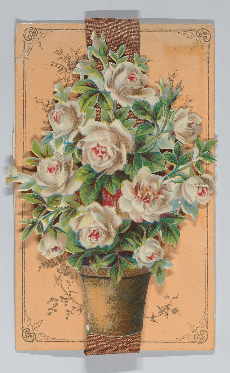 - Medium: Heavy card stock, chromolithography, die-cut scraps, brown silk ribbon
