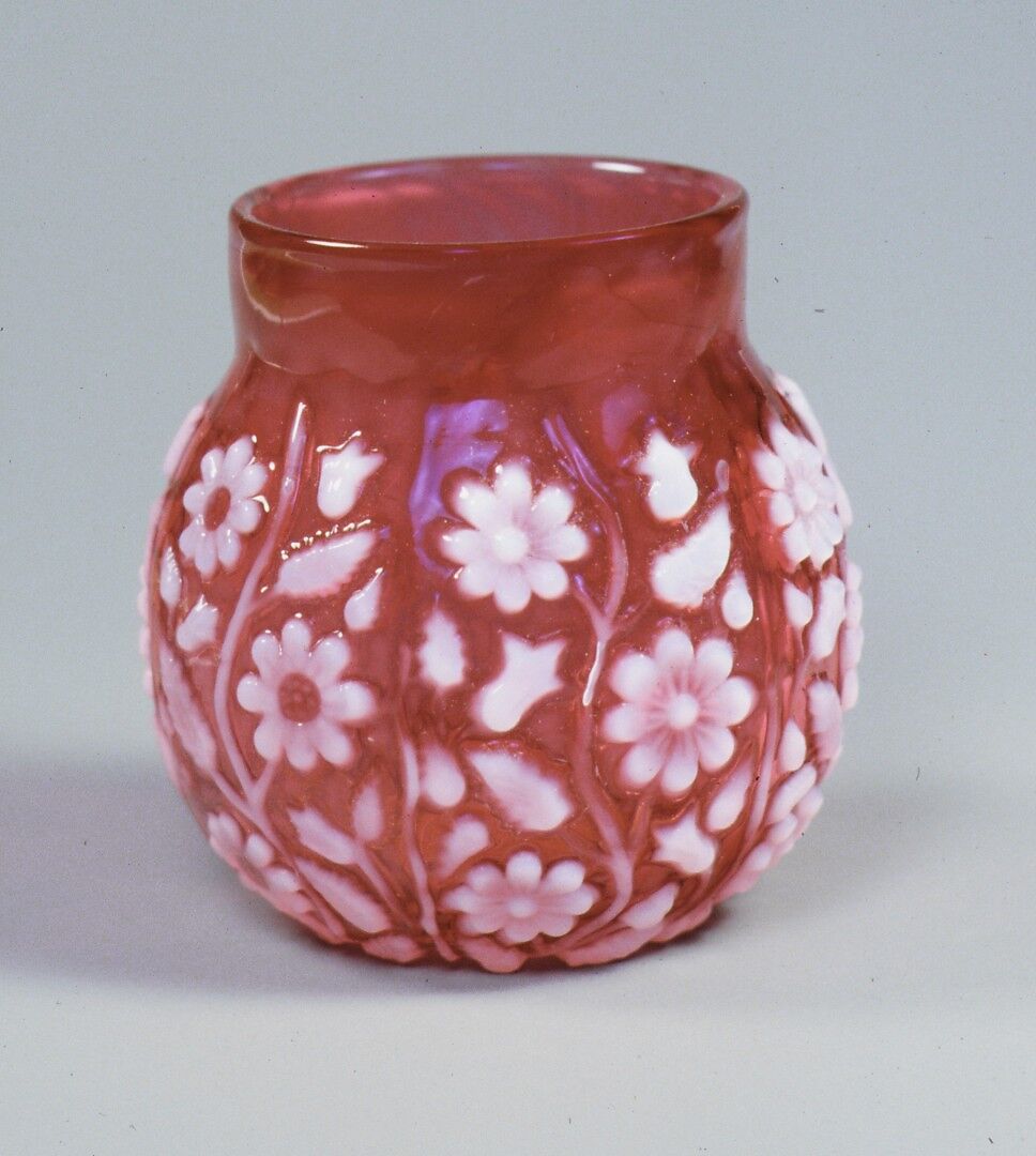 This spoon holder descended in the family of George W. Leighton, who in 1889 received the patent for "onyx" glass of which this piece is an example.