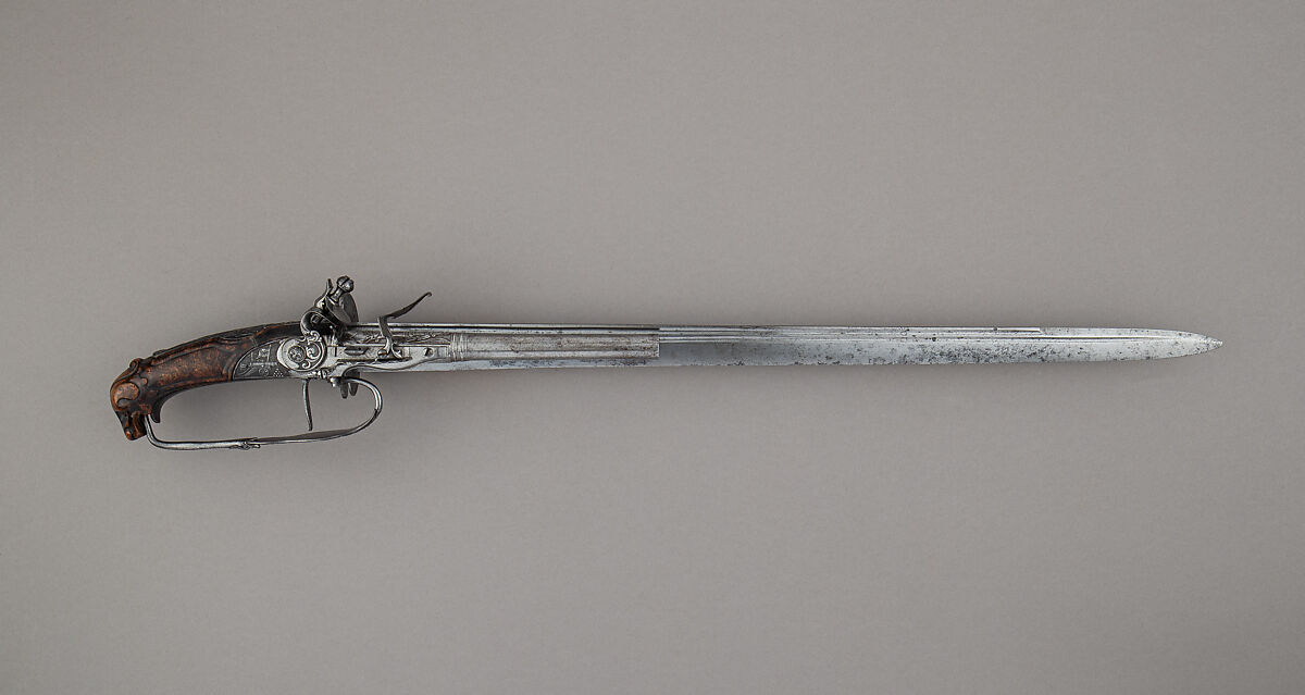 A rare example of a distinctly German type of hunting weapon, this combination sword and flintlock pistol may be dated to about 1730 and confidently attributed to the gunmaker Johann Andreas Niefind (1674–1731) of Olbernhau, Saxony, on account of its similarities to works bearing his signature. It is one of only four such weapons he is known to have made, and unique for the martial inspiration of its refined chiseled ornamentation. Its blade, which is shorter than the other known examples, suggests that it was perhaps made to the measure of a specific individual. Combination swords and pistols were used for hunting deer and were popular through much of the eighteenth century.