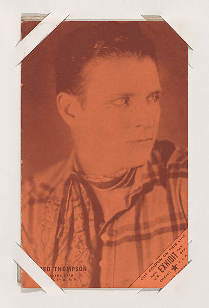 From Western Stars or Scenes Exhibit From Western Stars or Scenes Exhibit Cards series (W412). Distributed by Exhibit Supply Company of Chicago. Dispensed in arcade machines. Postcard-sized thick card. Orange toned.