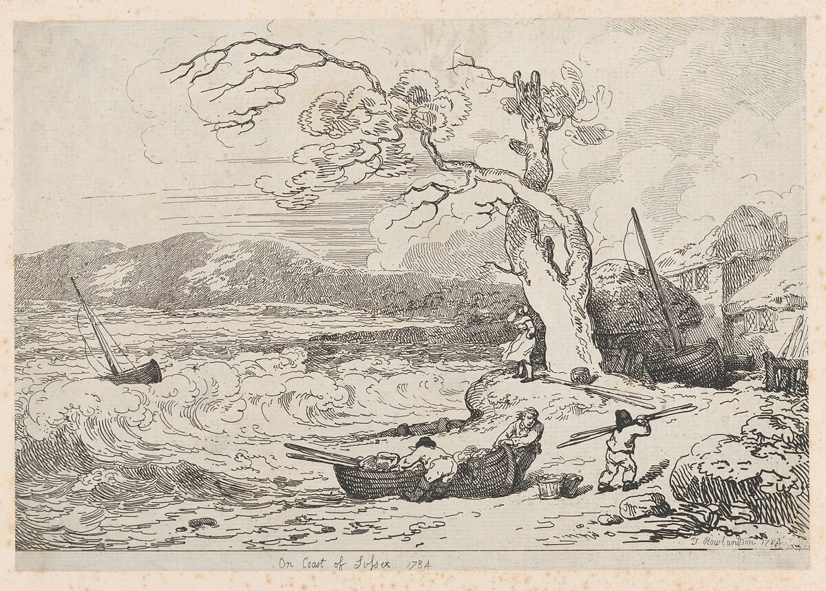 In a style reminiscent of John Hamilton Mortimer, Rowlandson here describes a windblown coastal landscape with two fishermen men on a small beach pulling up their rowboat, and a third carrying a pair of oars up the beach. Behind and at right is a cluster of thatched cottages, and a woman standing next to a tree looking across the water. Slightly off shore a sailboat is tossed by waves. In the distance at left, low hills are shown along the coast.