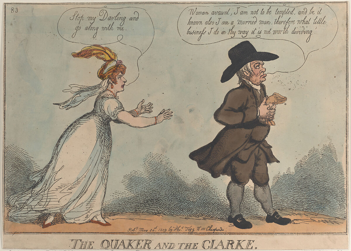 Mrs. Clarke runs with arms extended towards the Quaker at right declaring, "Stop my Darling and go along with me." The Quaker walks away from her, clasping his gloves to his chest and remarking, "Woman avaunt, I am not to be tempted, and be it known also I am a married man, therefore what little business I do in thy way it is not worth dividing."