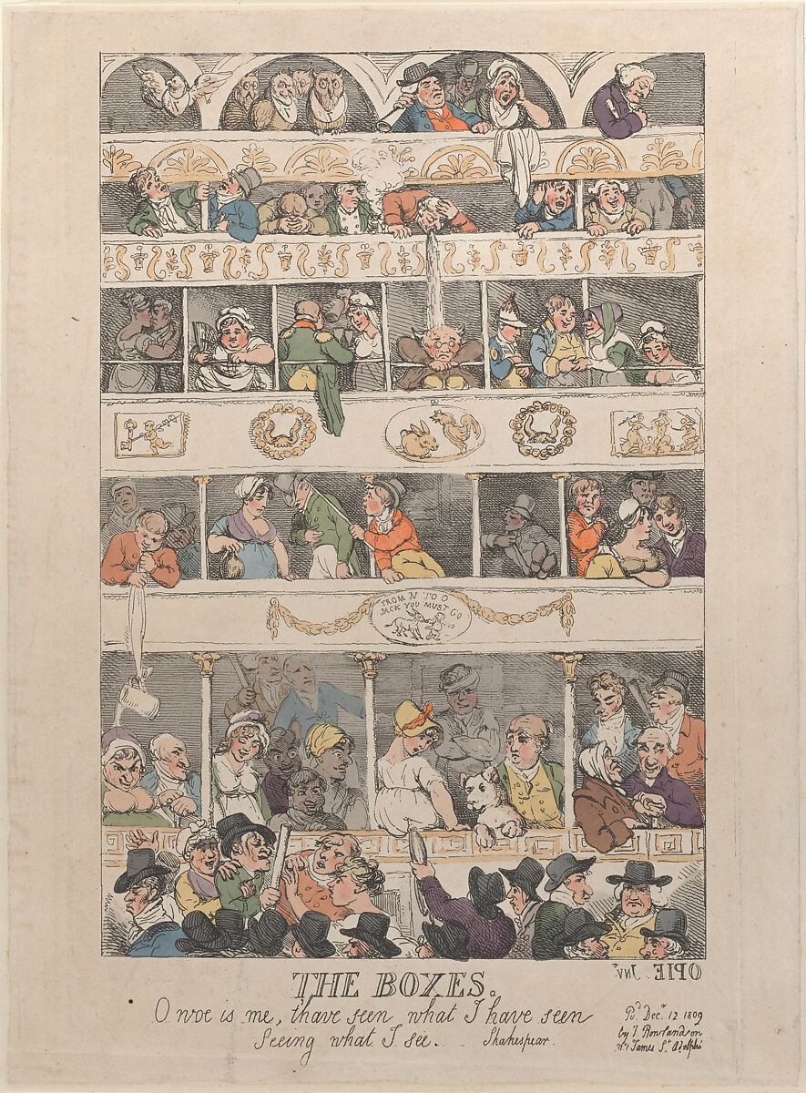 A view of a narrow section of the auditorium of Covent Garden theater, with "pigeon-holes" along the upper margin, and the heads and shoulders of people in the pit below.