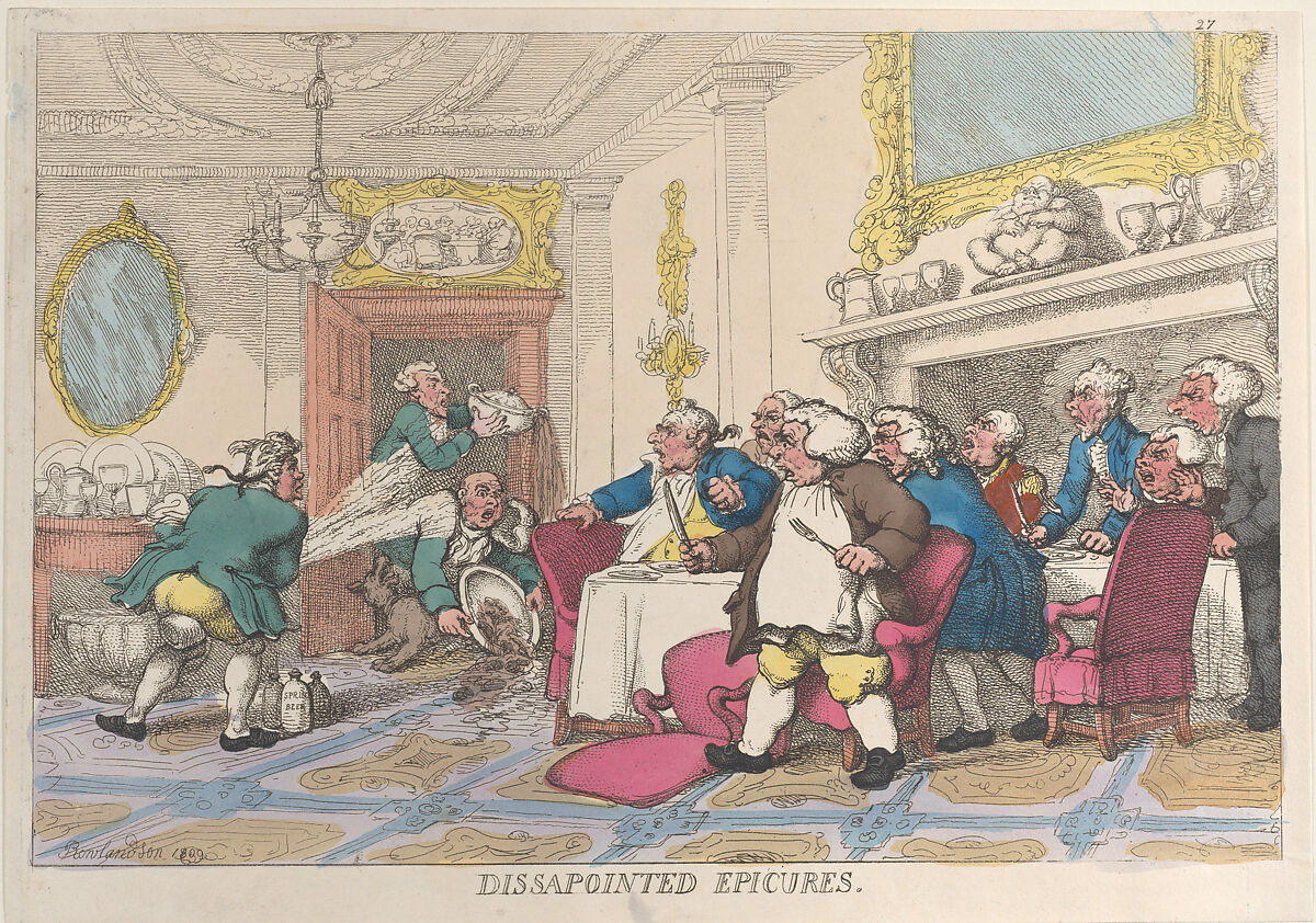 At right, eight elderly male diners rise from their chairs in surprise to angrily look towards an accident caused by a dog who has tripped a servant in the doorway, making him spill the contents of a serving dish, which has then caused the man behind to spill liquid out of a tureen. At left, a third servant, distracted by the incident, sprays the contents of a bottle of spruce beer onto the other two servants.