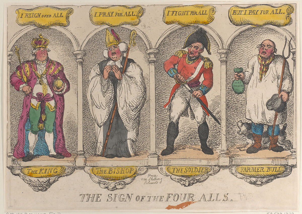 Four figures, The King, The Bishop, The Soldier, and Farmer Bull, stand in niches divided by columns. Across the top, corresponding to each figure below, are the phrases, "I Reign Over All," "I Pray For All," "I Fight For All," and "But I Pay For All."