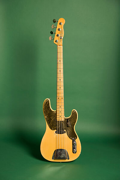 This work of art is currently on loan to the museum.Leo Fender introduced the Precision bass (commonly known as the P-bass) in 1951. Named for the precise intonation enabled by its fretted neck, the P-bass was the first commercially successful electric bass guitar and set off a revolution in popular music. Jazz bassists could compete with the high volumes of big bands, and guitarists could double on bass without the struggle of learning a cumbersome fretless instrument. This bass is one of the first five P-basses made by Fender, identifiable by the cracking lacquer on its Bakelite pickguard, and was previously in the collection of the Who’s John Entwistle.