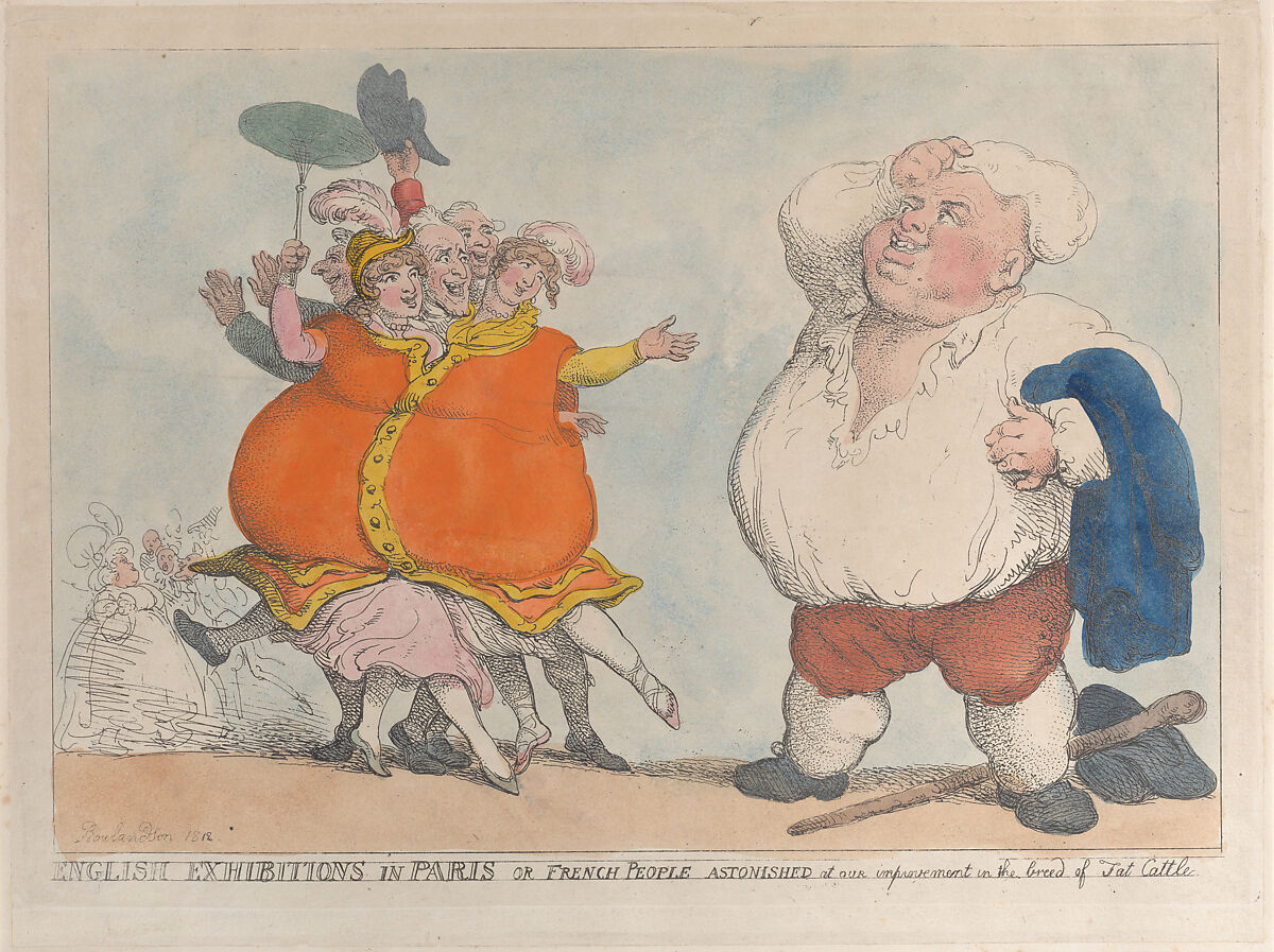 A portly Englishman, at right, are mocked by a group of at least five Parisians, who have gathered themselves into his buttoned up wasitcoat.