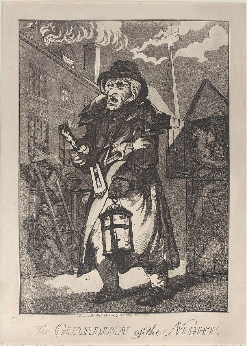 A watchman walks towards the left with a lantern and a club. A man and a woman kiss in a booth behind him at right, and two men climb into a second story window with a ladder behind him at left.
