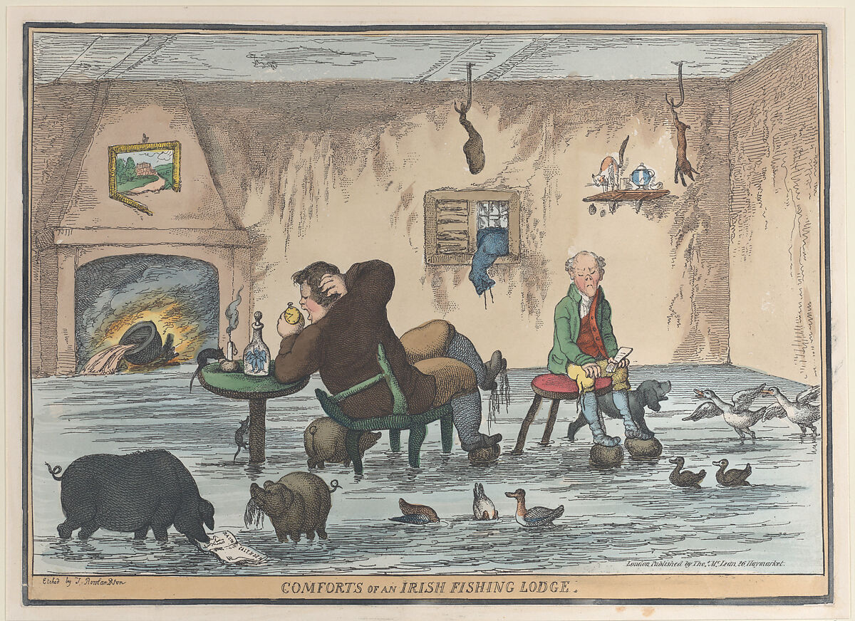 Two men seated in a run-down, flooded room, where pigs and birds are wading. Rats climb up the table at left, and a scared cat stands on a shelf on the wall at right.