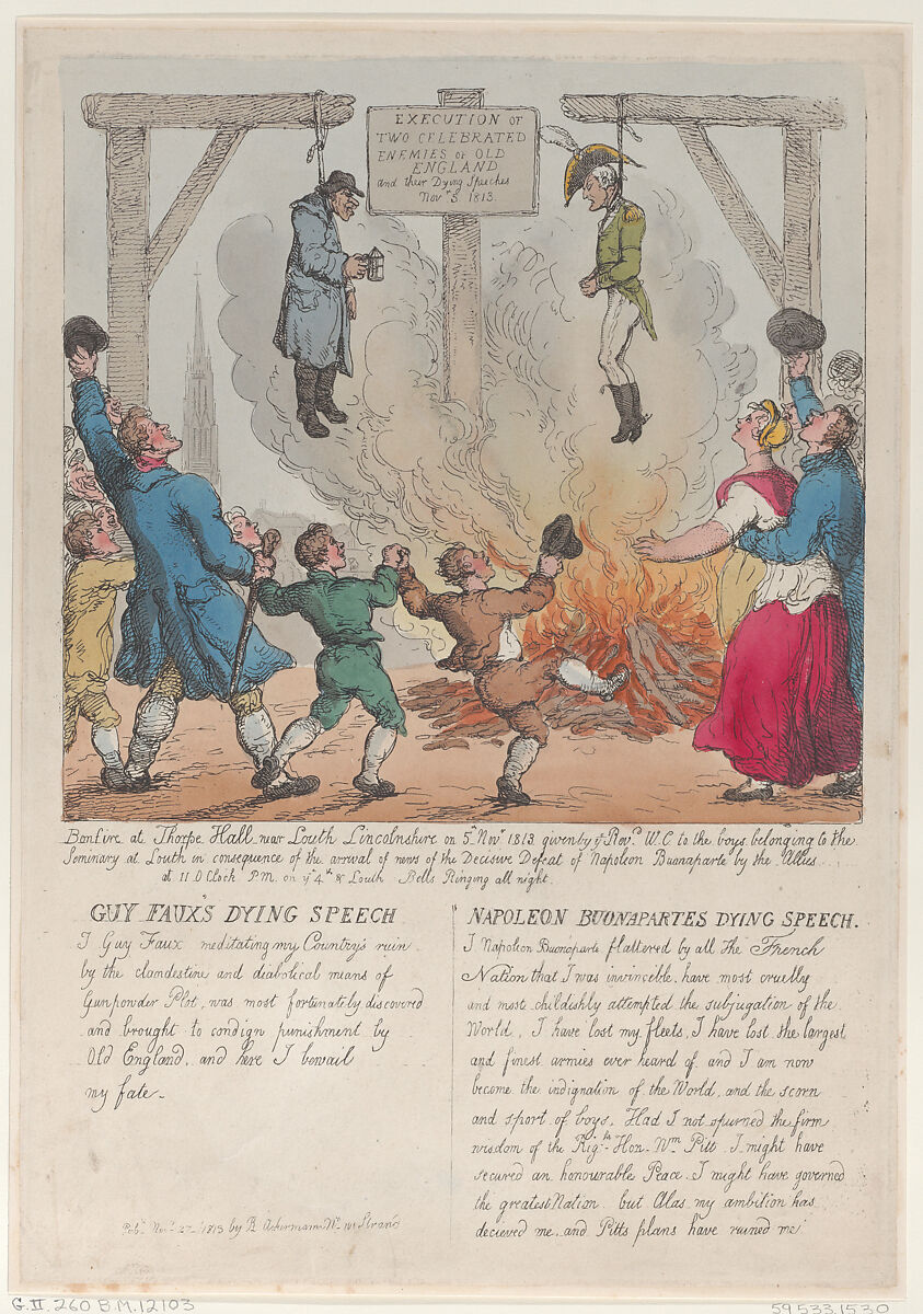 Napoleon Bonaparte and Guy Fawkes hanging from gibbets above a bonfire. Their dying speeches are inscribed below.