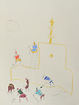 After moving to New York 1976, his style changed to focus increasingly on compositions influenced by the collapsed perspective and mid-ground composition of Persian miniature painting. At the same time, he rendered figures in a loose and vividly animated line. Scenes depicting literary, courtly and religious themes became common. This drawing depicts men with picks and shovels. They appear to be building the mosque that appears in outline behind them. Two men sit and stand atop the mosque. Another smiling figure performs a backbend. A large circle, or sun, appears in the top left hand corner.