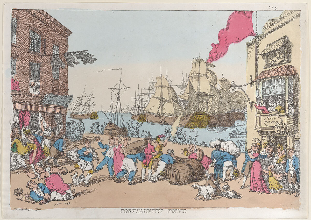 A harbor scene with an old clothes shop at left with a sign that reads, "Moses Levy Money Lent." At right is the "Ship Tavern." Ships sail off the coast and dock at the harbor. People are bustling to depart in the foreground: baggage is carried, casks are rolled, sailors and and women embrace or fight.