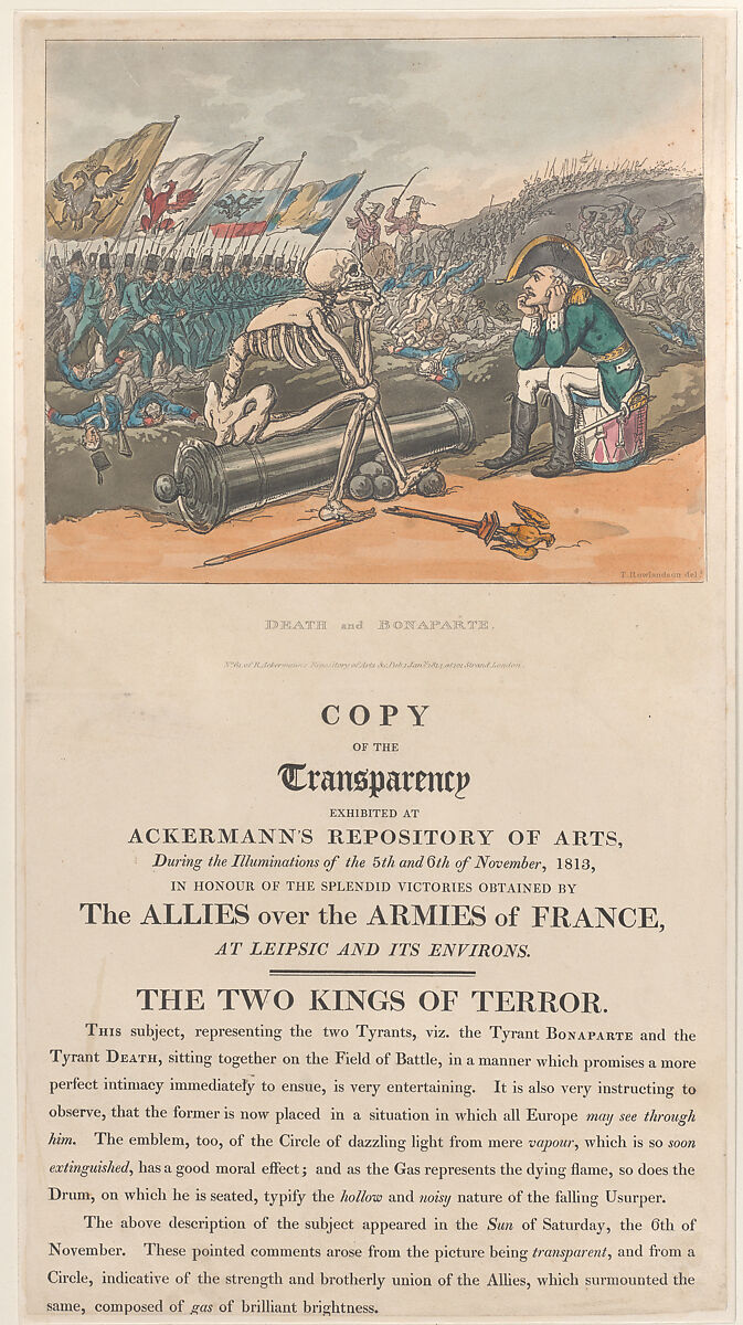 A skeleton, Death, is seated on a cannon at left, and Napoleon is seated on a drum at right. Behind them is a symbolic representation of the "Battle of the Nations."