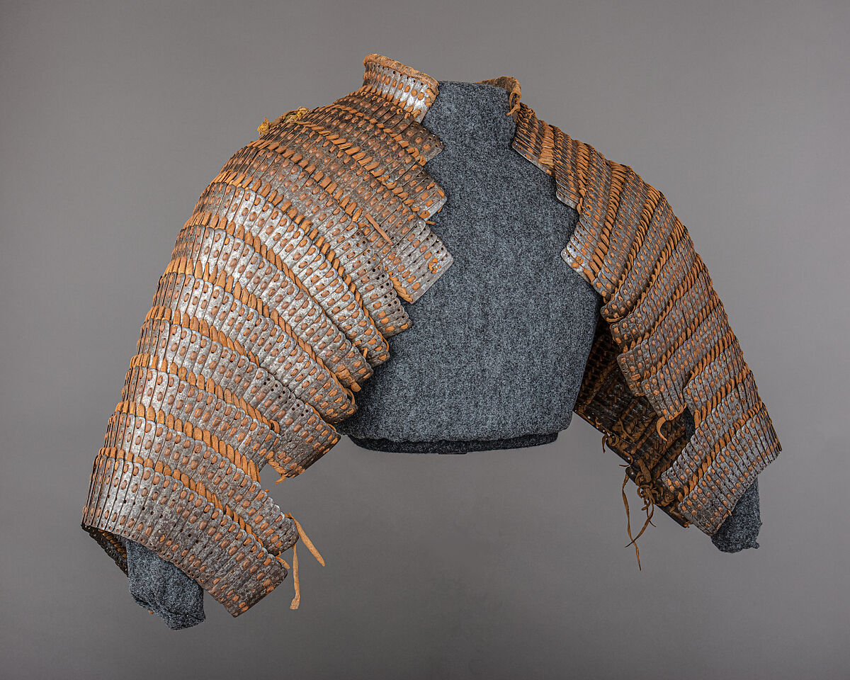 The lamellar armor is designed to cover the base of the neck, shoulders, and upper arms to about the elbows, mainly comprising a neck piece of a single row and two sleeves made up of eleven rows of iron lamellae joined by integral leather lacing. Seen from the outside, the lamellae of the neck piece overlap from right to left; the lamellae of the sleeves overlap from the back towards the front (left sleeve from right to left and right sleeve from left to right). The rows of the sleeves overlap upward and are laced in the typical manner for lamellar armor of this region and period. The individual lamellae measure about 2 ¾ in. by ¾ in. (7 x 1.9 cm) and are pierced with thirteen lacing holes each. The lamellae of the neck row are bent inward slightly to form a gentle curve and the row is fully lined with leather on its interior; there is a short row of ten lamellae loosely laced to the top edge of the center of the neck. The third row from the bottom of each sleeve is shorter by several lamellae on its inner aspect. There several colored textile laces arranged in a small loose bundle on the second row from the top of the right shoulder.