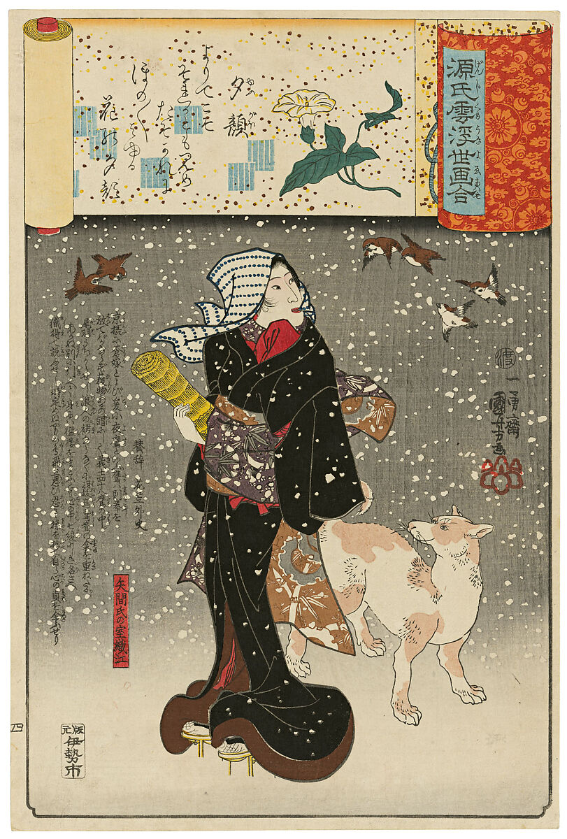 This print from a set of sixty intriguingly combines references from The Tale of Genji’s Chapter 4, “The Lady of the Evening Faces,” with a seemingly unrelated scene from Kabuki theater—a culmination of Edo-period experimentation with parodic imagery. What does a streetwalker with a dog on a snowy night have to do with Genji? The woman is Orie, estranged wife of one of the “Forty-Seven Rōnin” featured in numerous Kabuki and puppet plays. Here she is conflated with the tragic heroine Yūgao, invoked by the yūgao (moonflower) blossom and Genji poem on the scroll above. Like Yūgao, who was killed by an angry spirit, Orie will meet a violent demise before the night is through