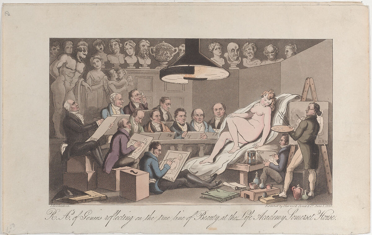 This print was published to illustrate Charles Molloy Westmacott's "English Spy" (1832), which describes London's art world. Here, a nude female model reclines on a draped chair sketched by Royal Academicians. Each artist's easel is initialed, allowing us to identify Benjamin Robert Haydon, Martin Archer Shee, Sir Thomas Lawrence, Benjamin West, Richard Westmacott, John Jackson, Joseph Farington, and Francis Chantrey. The "Line of Beauty," which the title evokes, was an aesthetic concept promoted by William Hogarth.