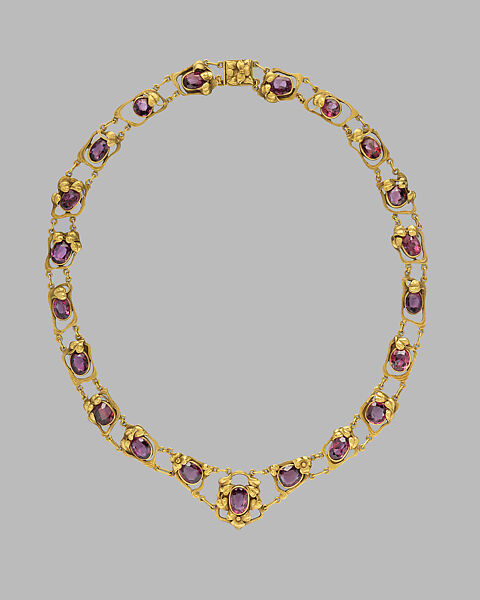 The Kalo Shop, one of the earliest, largest, and most productive of Chicago's metalworking concerns, was founded in 1900 by Clara P. Barck (1868–1965) and a small group of women designers—all graduates of the School of the Art Institute of Chicago. Under Clara Barck’s management and that of her husband, George S. Welles, the Kalo community became a school and workshop for aspiring artisans, many of them women. Their work was largely hand-wrought and reflects the tenets of simplicity and utility set forth by the Kalo motto, "Beautiful, Useful, and Enduring." Most Kalo jewelry is made of silver, sometimes set with semi-precious stones or pearls. The present necklace is a rare example of their work in gold. Each garnet is set in an asymmetrical openwork floral surround, exemplifying the Art Nouveau taste typical of their pre-1920 designs. It is often difficult to date their output because the same Kalo marks were used over a long period of time. Likewise, because their artisans were not allowed to add their own signatures, it is rare to be able to identify the actual jeweler.