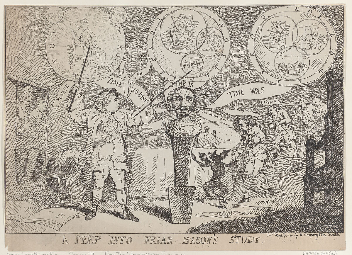 King George III is represented as Friar Bacon, standing in a magician's room and holding pointers at three circles, which represent the Constitution during different time periods. From left to right, they are inscribed "Time is Past," "Time Is," and "Time Was." The first shows the king seated on a throne surrounded with rays of glory emanating from him. Two small circles of the two Houses of Parliament sit on the exterior. The second has three circles within it, the King's being the largest, followed by the House of Lords, and then the House of Commons. The third contains three circles of equal size, representing three equal branches of government. Edmund Burke, Frederick North, and Charles James Fox look in through a doorway at left.
