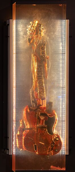 This work of art is currently on loan to the museum.While a student at Ealing Art College in London, Pete Townshend studied with Gustav Metzger, a founder of the Auto-Destructive Art movement. Embracing material destruction as a protest of capitalist production, Metzger’s philosophies guided the rebellious anger behind the musician’s smashing of instruments. Townshend destroyed this example during a photo shoot with Annie Liebovitz for Rolling Stone that resulted in “How to Launch Your Guitar in 17 Steps” (on view nearby). This sculpture made from the remains has been on display in the Rolling Stone office building for decades since.