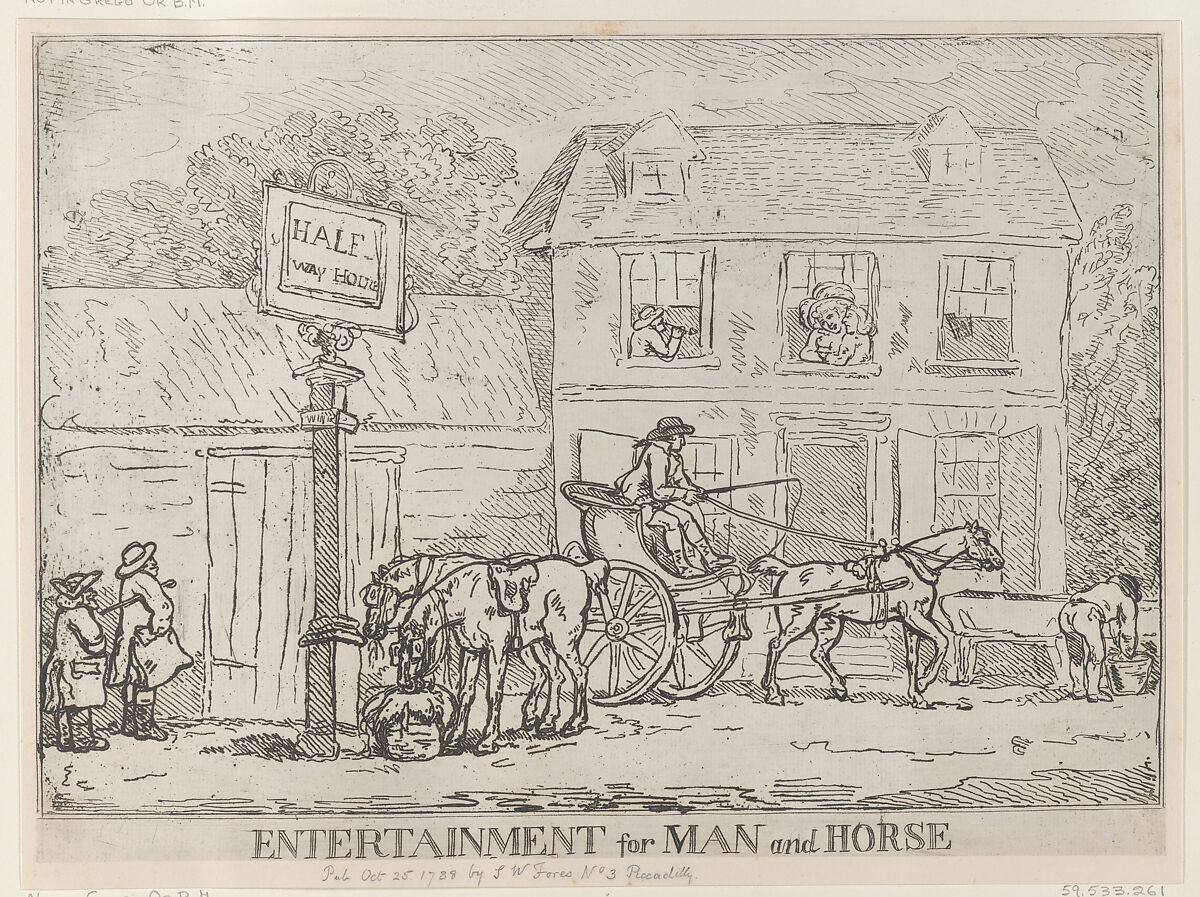 A carriage stands outside of a "Half-Way House." A man and woman embrace inside at the window, while the horses eat hay outside.