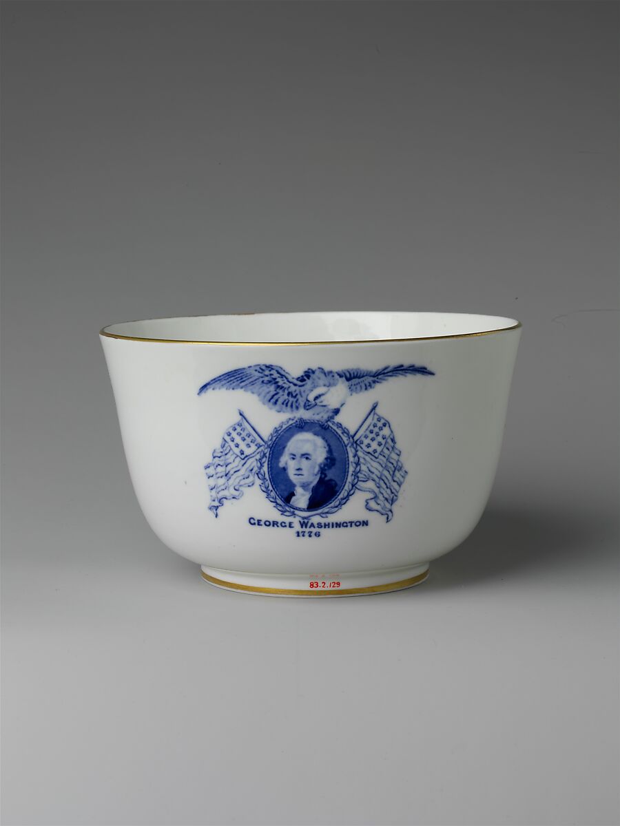 This bowl features a portrait of George Washington in an oval medallion surmounted by an eagle and two flags on either side.
