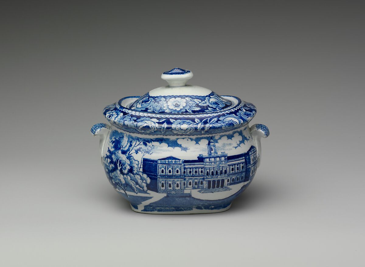 This blue and white transfer-printed earthenware sugar bowl made by the Staffordshire firm of Joseph Stubbs features a view of City Hall in New York. Located near Broadway and Park Row, City Hall was designed by New York architect John McComb, Jr. (1765–1853) and French-born New York engineer-architect Joseph Francois Mangin (?–after 1818). Construction lasted from 1803 to 1812 and cost more than $500,000. Situated on scenic landscaped grounds of City Hall Park, its expansive rusticated Massachusetts marble facade crowned by a towering cupola in an architectural blend of French Renaissance and English Georgian styles distinguished the edifice as one of the most impressive American municipal buildings of the era. It was a popular subject for transfer-printed export wares because of its obvious appeal to civic-minded American consumers. Another view of the building appears, for example, on a plate, 10.57.8, by John & William Ridgway (ca. 1814–1830). Both views of City Hall by Stubbs and Ridgway were based on a drawing by Irish painter William Guy Wall (1792–after 1863) engraved by London-born New York and Philadelphia engraver John Hill (1770–1850) and published in 1826 by Behr & Kahl. The engraving was dedicated to Philip Hone (1780–1851), mayor of New York from 1825 to 1826, and was completed shortly after changes were made to the figure of Justice on the cupola. Stubbs adapted Wall’s composition for a pair of architectural American views with identical borders of large roses in full bloom produced for the United States export market. The pendant view is of the Boston State House. The American Wing's collection also contains additional pieces by Stubbs. Refer to the Dictionary for a definition of the term "transfer printing" and for information about the above-mentioned firms.