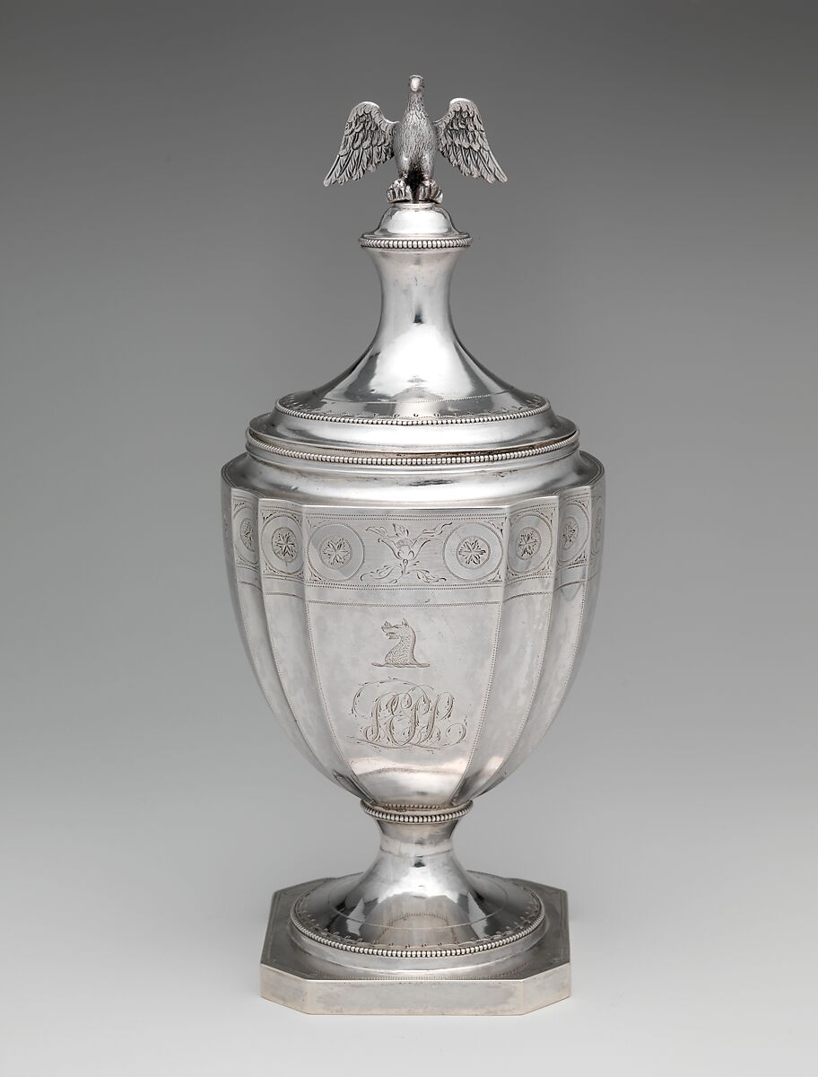 This handsome tea and coffee service (1980.503.1--.4), although unmarked, has been attributed to the Philadelphia silversmith Christian Wiltberger on the basis of style. Stately and dignified, with its fluted forms and generous proportions, it represents the fully matured Neoclassical style. The service belonged to Eleanor Parke (Nelly) Custis (1779–1852), granddaughter of Martha Washington, who married George Washington's nephew Lawrence Lewis (1767–1839) on February 22, 1799. Family tradition holds that the service was a gift from General Lafayette and his son, who were close friends of the family. In addition to the matching bands of bright-cut ornament, each piece is engraved with the Lewis crest and with the script monogram "LEPL" for Lawrence and Eleanor Parke Lewis. In place of the customary urn or flame-shaped finial, cast eagles surmount three of the pieces, especially appropriate for America's first family.