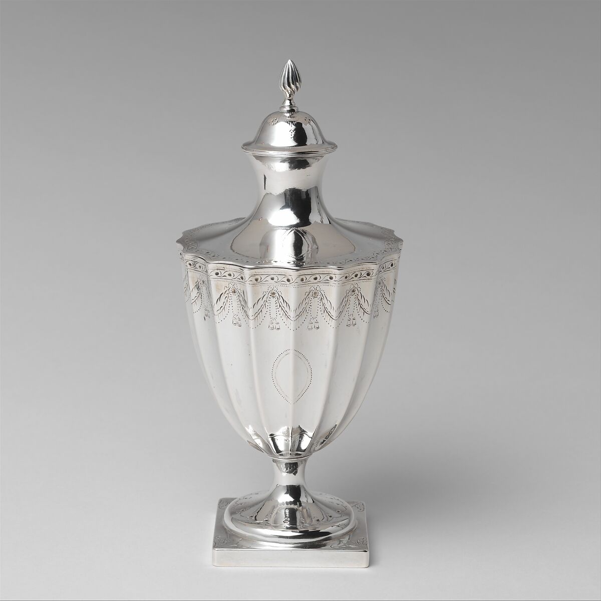 This matched set of covered sugar bowl and creamer is fashioned in the fluted Neoclassical style so popular with Revere's postwar clients. Urn-shaped sugar bowls, both plain and fluted, appear repeatedly in Revere's ledgers as "sugar urns" or "fluted sugar vases." The helmet-shaped creampot with high looped handle and square plinth also epitomizes Neoclassical taste. Each piece is engraved with bright-cut bands of tasseled swags and wavescroll ornament. According to family tradition, these objects were made as a gift for a Virginia bride.
