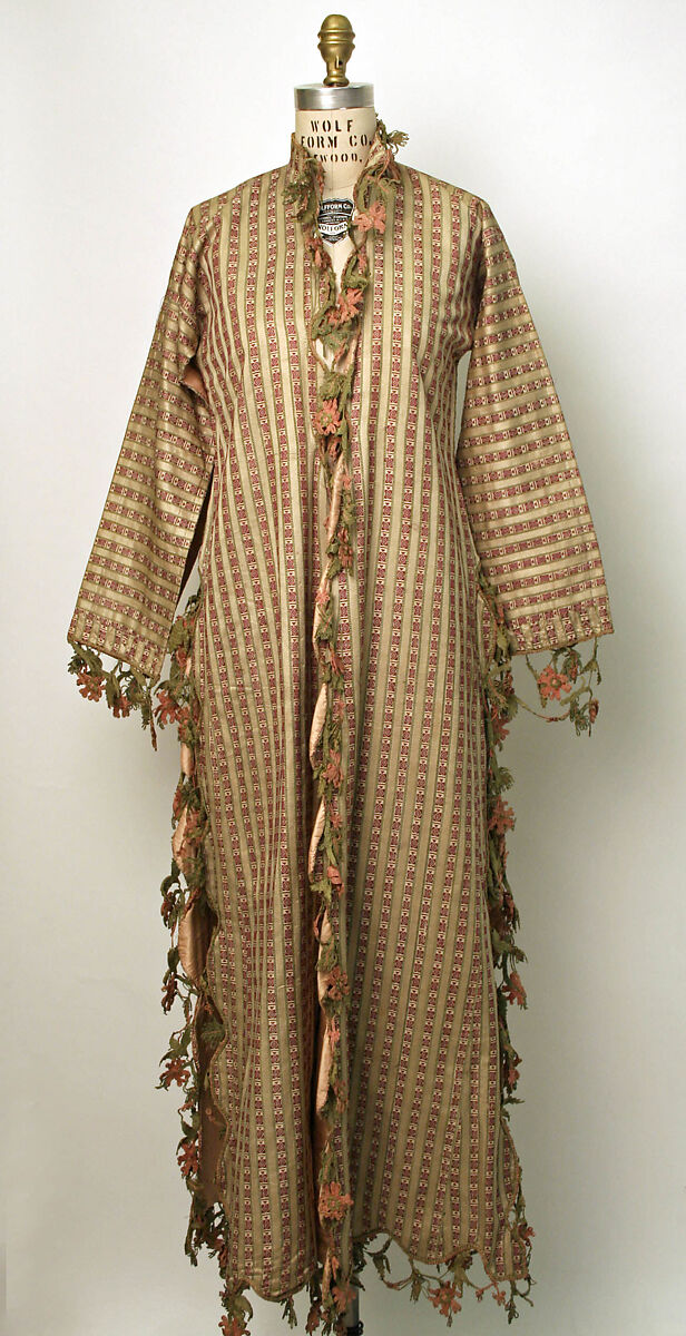 The entari, or robe, was the main element of women’s dress in the Ottoman Empire, worn together with a chemise, or gömlek, and baggy trousers, or şalvar. Striking both because of its striped fabric and elaborate, knotted trim, this entari is made from a silk and cotton fabric called kutnu. Kutnu was made using silk warps and wefts that are cotton, or a mixture of silk and cotton, and as in this example, is often striped. The striped design is executed using extra warps of silk. A piece of this same textile identified as having been produced in Bursa, an important Ottoman silk production center, is in an Istanbul textile collection. The entari has a small stand-up collar, long sleeves open for their entire length, and is open down the front. The skirt is slit nearly to the waist, and the back skirt has a center slit, which makes this a four-skirt or dört etek entari, a much less common version of the entari. Long narrow triangular pieces of fabric have been added to the front and sides to increase the fullness of the skirt. The front, side slits and hem are all scalloped, while the sleeve ends are straight and finished with a narrow band of the garment fabric, arranged with the stripes perpendicular to the rest of the sleeve.