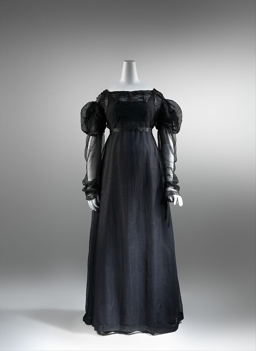 This mourning dress incorporates the puffed sleeves and ornate hem details that defined 1820s fashions. Standards for family mourning were modeled after court conventions. Upon a royal death in England, orders were issued detailing the duration of each phase of mourning and appropriate materials. Silk satins, taffetas, and velvet, considered too glossy and sumptuous for the first stage, were permitted later.