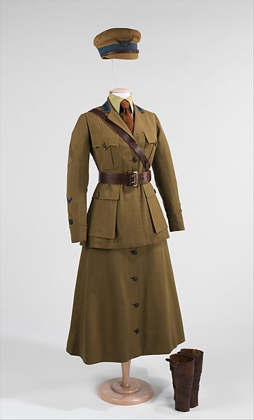 The Women's Motor Corps of America provided a way for women to participate in the First World War. Taking advantage of the advent of the automobile, women volunteered as drivers and provided transport services at home and abroad. This ensemble, with its Sam Brown belt and leather leggings, emulates the composition of the men's uniform at the time.