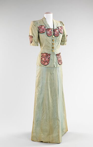 An excellent example of several hallmarks of Schiaparelli's career, Surrealist overtones and unusual closures, this evening ensemble from the summer 1940 collection was worn by one her most devoted clients, the stylish Millicent Rogers. The center of attention is the shield-shaped decorations. The orientation and pocket-like shape are reminiscent of Schiaparelli's "desk" suit, designed in collaboration with Salvador Dalí for the winter 1936-37 collection. The Surrealist idea of an object being other than what it seems was explored by Schiaparelli throughout her career. Although all the shields are identical, some act as pockets, while others are strictly decoration. Schiaparelli used unique closures throughout her career, such as these buttons, in the form of stylized gold ingots. The intentional use of off-beat closures is indicative of Schiaparelli's stance that fashion can be an artistic expression. The thoughtful construction of the dress in reference to the flattering orientation of the stripes, especially at the back waist and the skirt, is indicative of the feminine overtones of the summer 1940 collection.