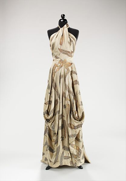 Front-point drapery is a signature James form that he reiterated throughout the 1930s and 1940s. The distinctive sculptural effect of this early example contrasts with the prevailing style for body-cleaving, bias-cut styles typical of the period. The dress also features an innovative halter bodice, which appears to be wrapped spontaneously but is in reality composed of five meticulously joined pattern pieces. James rarely used figured fabrics, preferring to give line and form priority. However, by varying directions of the fabric's grain when cutting and joining the pieces, he masterfully manipulated the leaf motif of this rare and expensive silk to emphasize the vertical and diagonal bodice lines, while at the same time creating the impression of random patterning in the skirt, an impossibility for a woven fabric.