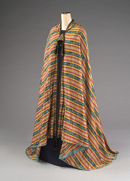 The design of this cape is closely linked to the influence of "Orientalism" on the design of and demand for Syrian textiles. The term "orientalism" reflects Western travelers’ intense fascination with the Middle East during the late nineteenth and early twentieth centuries. Syrian textile producers created new products to satisfy the tastes of this new group of consumers. Although its shape resembles that of Moroccan and Algerian capes, the garment’s style and the use of a characteristically Syrian striped fabric alternating with bands of Arabic calligraphy suggest that it was made to appeal to foreigners visiting Syria. The calligraphy features the repeated phrase "There is no god but Allah."