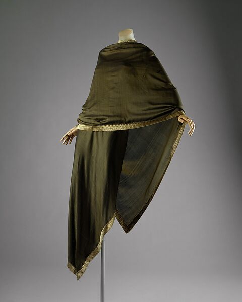 A loyal client provided Balenciaga with an Indian sari and asked the designer to create a dress. Balenciaga rendered couture technique to the flat textile, cutting apart the woven edging and appliquéing it to form a border for the whole garment. In this way, he respected the Indian source but addressed the textile as if it were a couture fabric. India, and in particular the tradition of the sari, had long captivated the West. Bias draping of the 1920s and 1930s was influenced by the sari. That Balenciaga pursued the idea in the 1960s is late evidence of this long tradition.