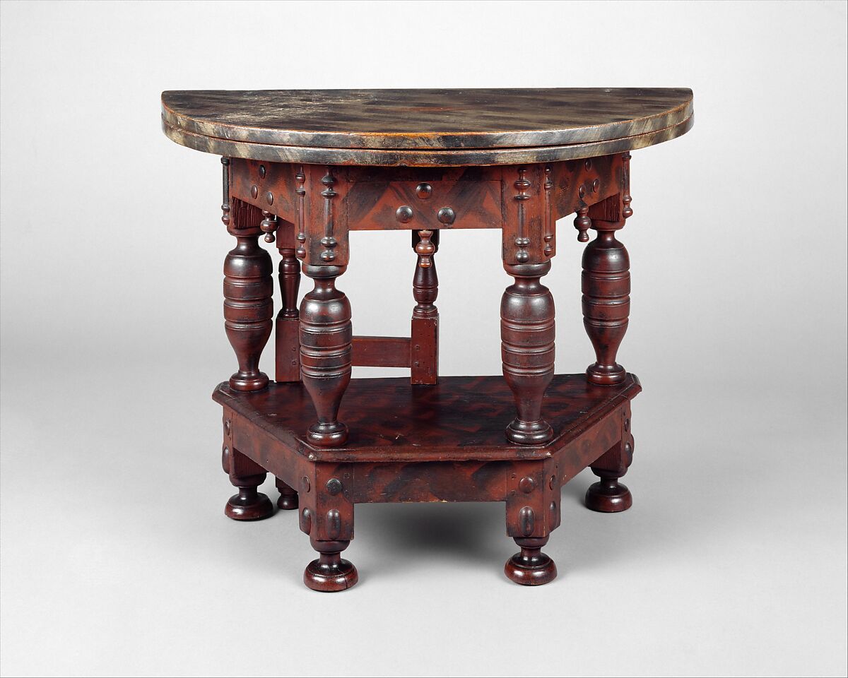 The heavy balusters and applied bosses on this table may indicate that it was produced en suite with a matching cupboard, since such bold decorative elements were more commonly found on that form. The polygonal frame has a two-part, hinged circular top that opens and rests on the pivot support, or gate. The present grain-painted surface is not original and may date to the eighteenth century.