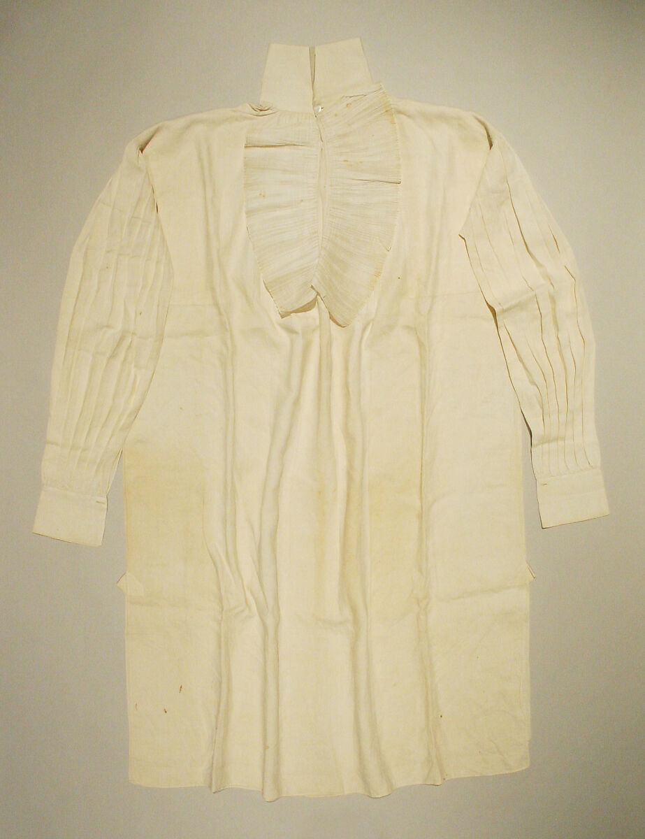 A shirt for the hero of Tom Jones, this linen origami of pleated shirting suggests the attention afforded to a gentleman's linens in the eighteenth century. The flare, or self-cravat, suggests the peacock that such a man was. This piece is a real rarity; there is one similar shirt in the collection of Colonial Williamsburg in Virginia.