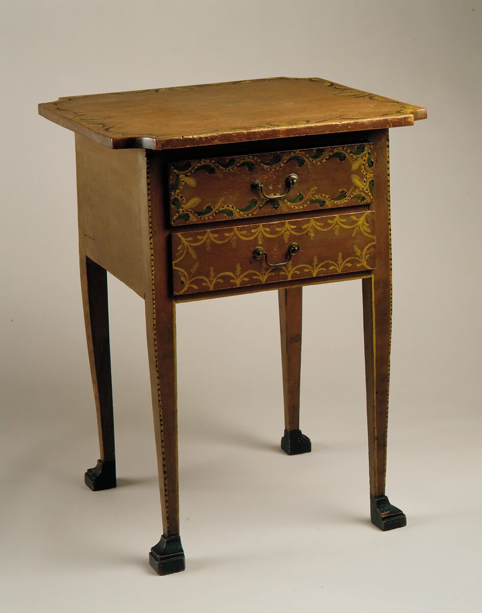 The painted decoration on this table simulates needlework. The painted lines along the outer edges of the legs imitate inlaid dentiled stringing. The slightly cabriole legs and inventive shod hoof feet reveal an unsophisticated attempt to imitate the earlier Queen Anne style.