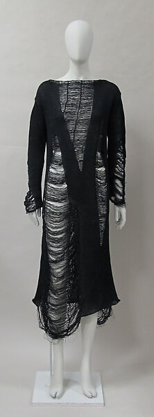 (Right figure) What could once only have seemed to be Miss Havisham's ruined raiment is the pointedly distressed version of a sweater elongated and eviscerated by Yamamoto. As it balances a clothing standard and its disarray, so the "deconstructed" sweater-dress equivocates among the seasons and could justly serve in any season. (Shown with 1994.9.3 by Jean Paul Gaultier.)