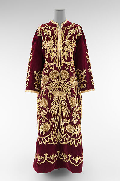 The bindalli dress was worn by both Muslim and Jewish women of different economic classes in the Balkans and Anatolia for weddings and other special occasions, beginning in the second half of the nineteenth century. The name, bindalli (bindallı in Turkish), means thousand branches and refers to the elaborate embroidered decoration carried out using a style called dival, characterized by the use of metal-wrapped threads and couching. Both the fabric used here, a wine-colored cotton velvet, and the shape of the dress, with its round neck, front opening, dropped shoulders and straight sleeves, are typical of this very popular genre of woman’s dress. Beautifully executed gold embroidery covers the body of the dress in an all over design of garlands, large flowers and other motifs. A scalloped design marks the neck and front opening. Additional designs ornament the sleeves and a floral garland encircles the hem of the dress. The sleeve edges and front opening are decorated with lace.
