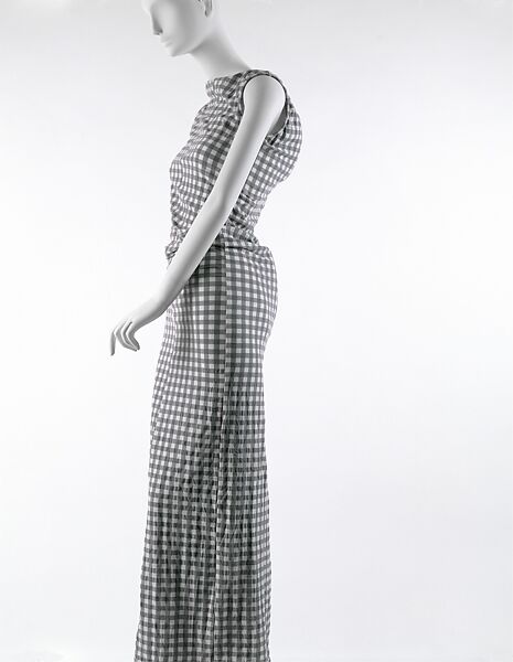 Spurring controversy in the fashion press and consumer public, and inspiration among design peers, the bulbous gingham dresses of Rei Kawakubo's 1997 women's line literally challenged the form of fashion. While Kawakubo has clearly demonstrated an interest in challenging various social, sexual, and economic stereotypes with her garments, this dress confronted one of the oldest taboos of fashionable and wealthy society: the shapes of the feminine ideal. Said to have been exploring the boundaries of malleable form in movement with padded bumps at bust, rear, and midriff combined with a stretchy synthetic gingham, Kawakubo has never verbally confirmed a frustration with fashion's passion for fit, even emaciated models and mannequins.