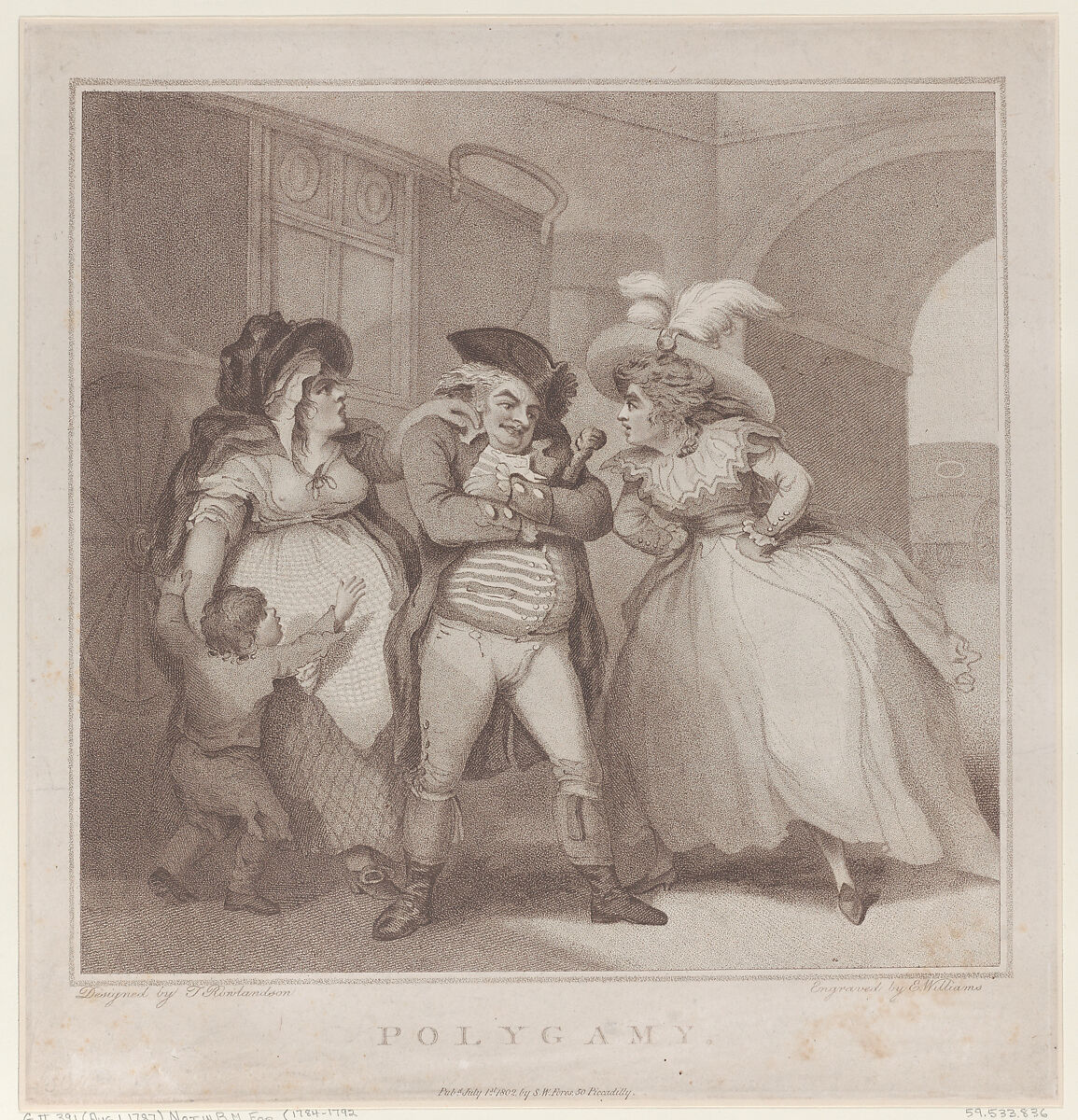 An altercation between a man and two women, with one woman has her hand on the man's shoulder and pushing off her child at left. The other, fashionably dressed, woman, stands with her hands on her hips. The husband stands at center with his arms folded and eyes downcast.
