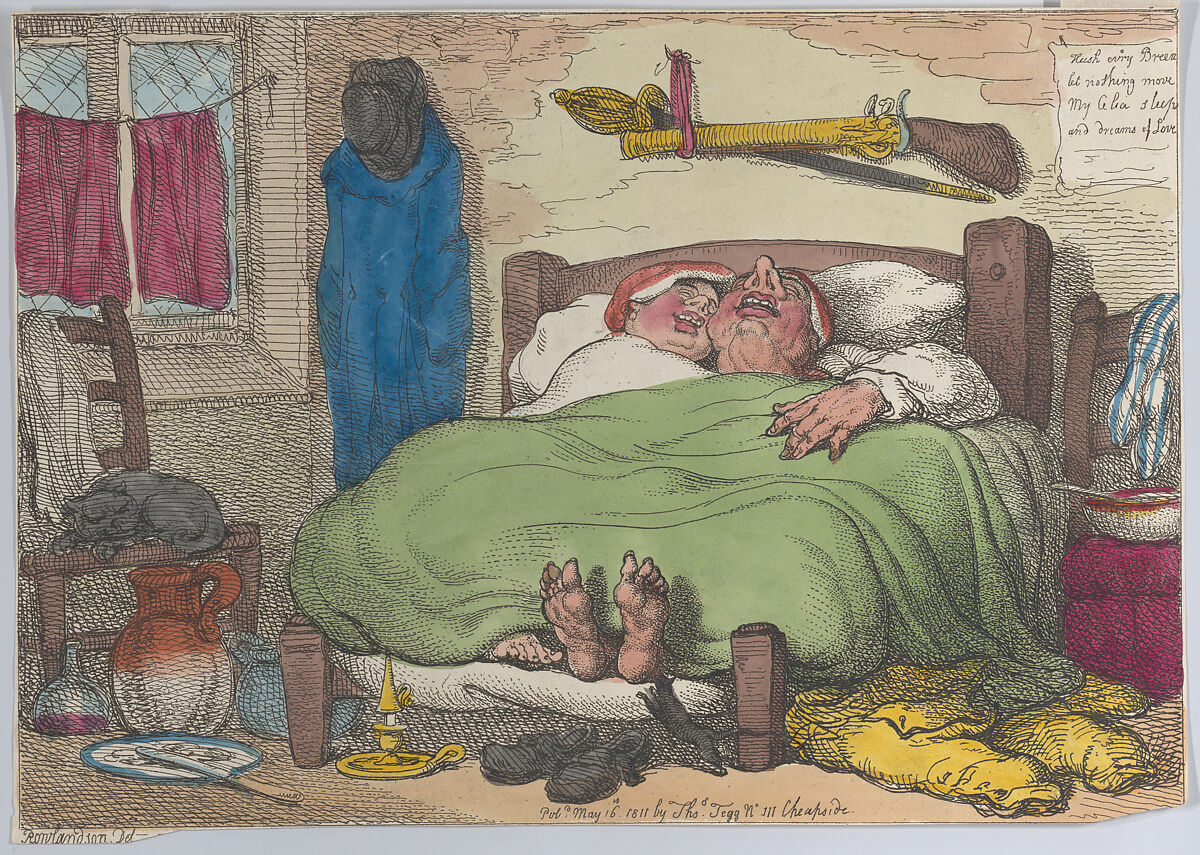 This is one of two prints that Rowlandson devoted to a snoring couple, using the title to suggest that the man projects a lower sound and the woman a higher. In this 1811 version published by Thomas Tegg, a detailed view of the couple's bedroom enhances the narrative, with the sword and shotgun hanging on the wall suggesting that the man was a soldier who has returned to a country life. In 1803, for William Holland, Rowlandson centered the image on the heads of the two sleepers (see 59.533.888 and 59.533.2018 for the earlier image; and 17.3.888-11 and 59.533.1398 for other impressions of this image).