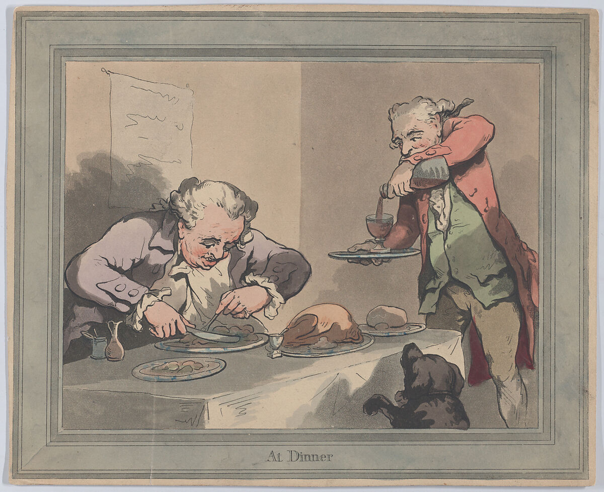 A man wearing a white wig, a jacket and ruffled cuffs bends over a table to eat with a knife and fork. At right is a roast chicken on a platter, with two other dishes to either side. A standing servant pours a glass of wine from a carafe, and a dog sits on its hind legs to smell the food at lower right. One of a series that Rowlandson made around the same time, titled: "Waiting for Dinner," "At Dinner," "After Dinner," and "Preparing for Supper."