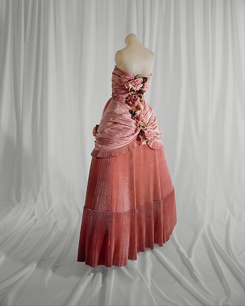 Keenly historicist, Balenciaga invented a fantasy of eighteenth-century court dress, knowing that Marie-Antoinette favored overdresses with swags anchored by roses. Sustained by wide panniers also appropriated from eighteenth-century fashion, Balenciaga renewed the Rococo rose for the 1940s and 1950s.