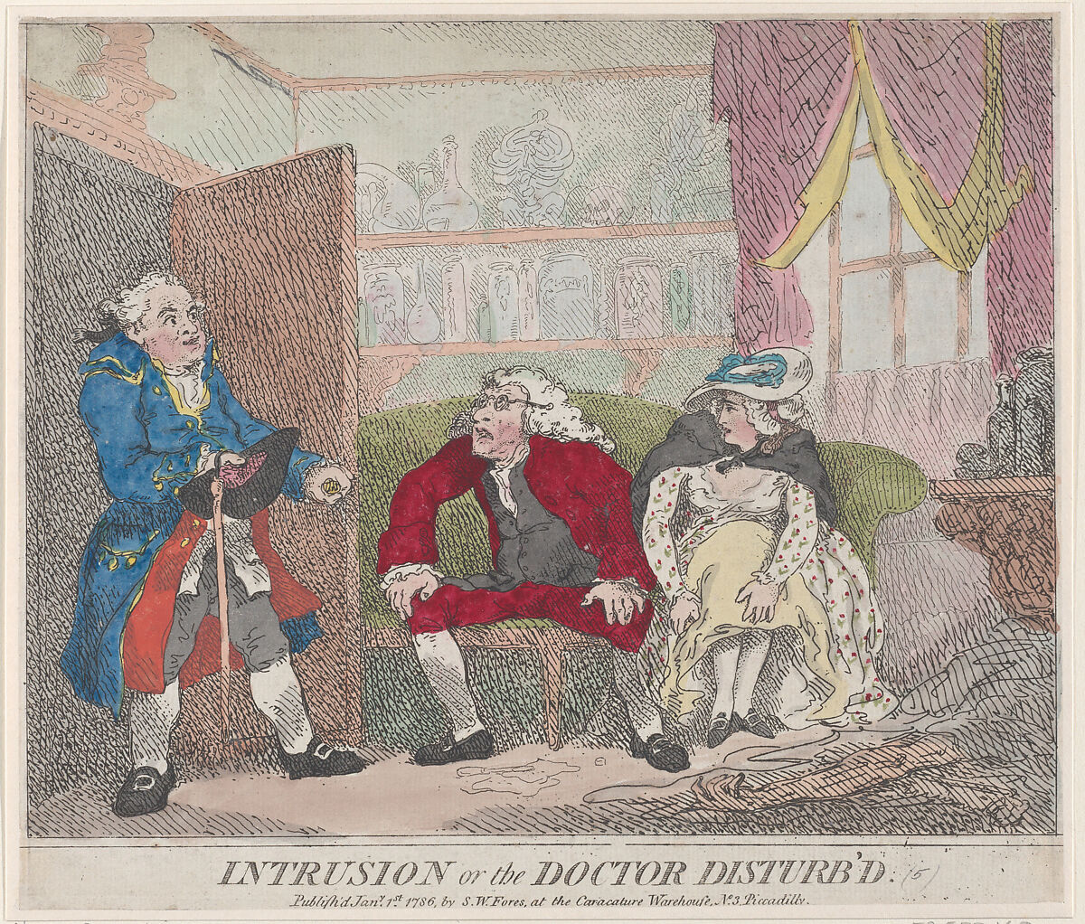 An elderly spectacled doctor sits on a sofa beside a young woman. They look up startled at the sudden entrance of a man carrying a hat and cane through a door at right. The woman clutches at her skirt as though to pat it back into place. Shelves behind contain jars of specimens, a skeleton torso and skull.