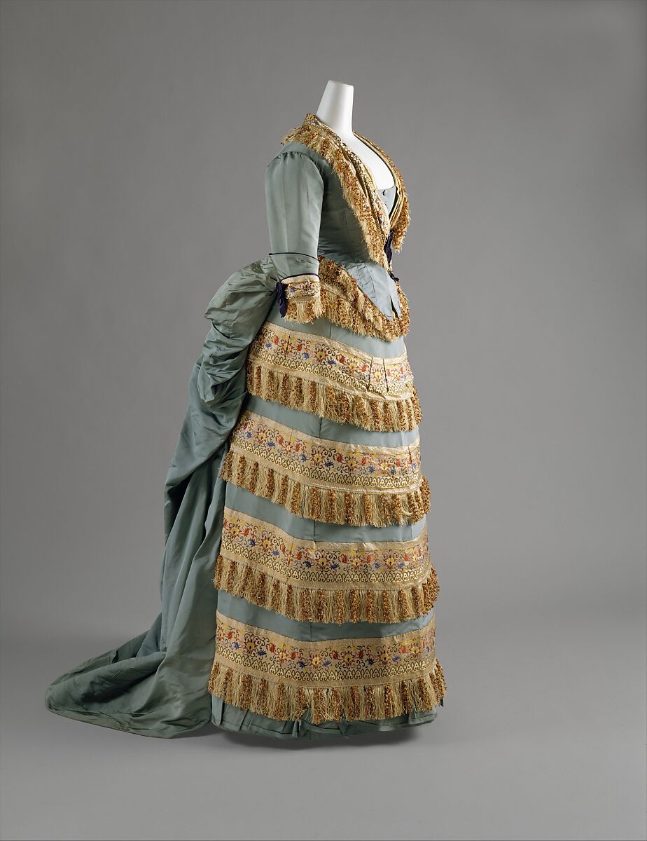Worth rarely scrutinized or adapted forms from the East; in this unusual example, he has emulated Middle Eastern enamels. More often, he was an instrument of a Western taste that was projected globally via imperialism. He is said to have created 250 dresses on commission from Empress Eugénie for her appearances at the opening of the Suez Canal in 1868. This gown was worn by Mrs. William De Forest Manice, the donor's grandmother, at both the French and English courts during the reigns of Napoleon III and Queen Victoria. When worn on such occasions, the dress had a detachable brocade train, since destroyed.